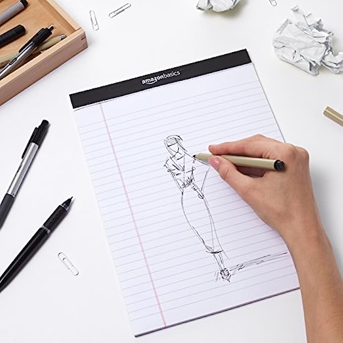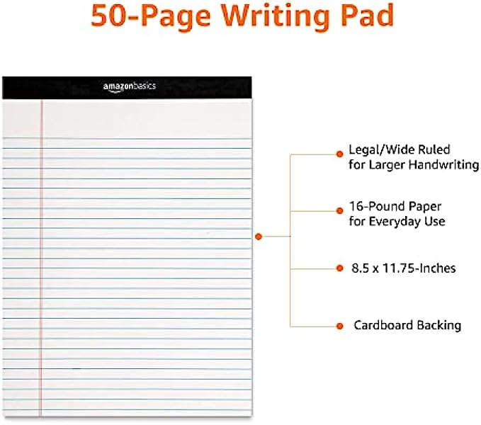 Legal note pad for everyday writing; ideal for home, office, school, or business Includes 12 legal pads, each with 50 letter-sized sheets of standard 16-pound white paper Wide ruled line spacing (11/32 inch) accommodates larger handwriting and easy note reading Perforated top edge allows for easily and neatly removing individual sheets of paper Cardboard backing offers added writing pad support Product dimensions: 8.5 x 11.75 inches (WxL)