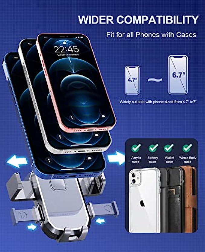 • 【UNIVERSAL】 Super wide arm enables this cell phone car holder mount to fit for all smart phones even with thick cases. Suitable for most cars, pickup trucks, SUVs, trucks and taxis. This is a great help for Uber and Lyft drivers.