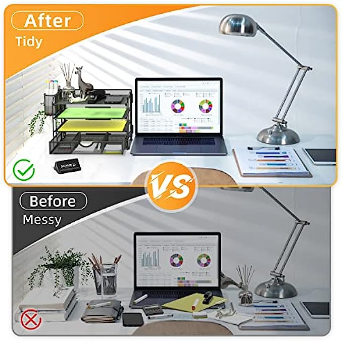 • 【Humanize Design】The desk stackable file tray, help you dentify the contents of each compartment quickly. Offer enough storage space to put up all office supplies, such as Letters/A4 Size Paper pens, pencils scissors, folders.