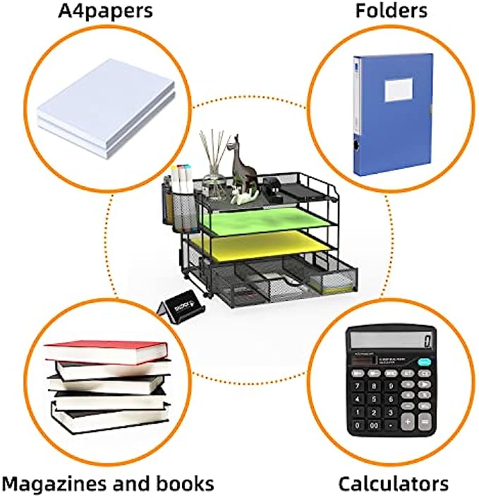 DALTACK 4-Trays Desktop File Organizer with Pen Holder,Letter Tray Paper Organizer with Drawer and Pen Holders,Black Mesh Office Supplies File Holder,Desk Organizer for Office School Home