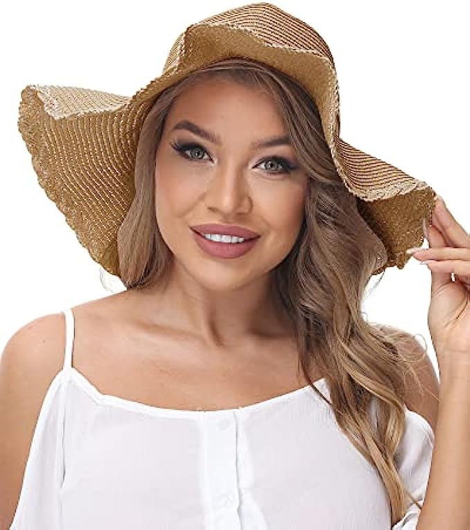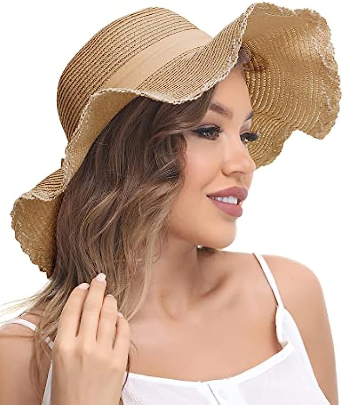 Dolcevida Women Straw Sun Hat Wide Brim UV Protection Beach Hat Summer Floppy Hat with Linen Bow