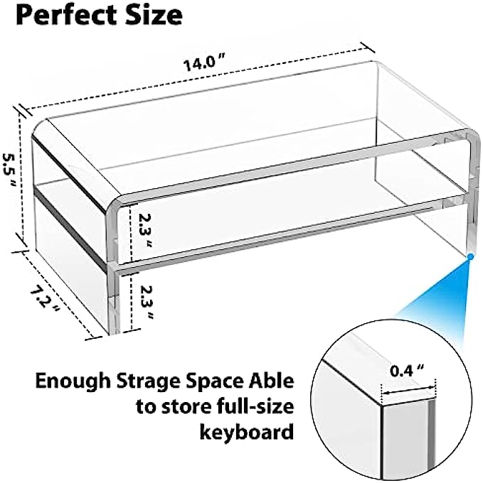 • 【MULTIFUNCTIONAL ACRYLIC STAND】The clear acrylic stand can not only place a computer monitor or laptop on the desktop, its strength and aesthetics can also be used for a variety of storage, such as organizing set-top boxes and remote controls under the TV; organizing files in the office ; organize books in the dormitory.