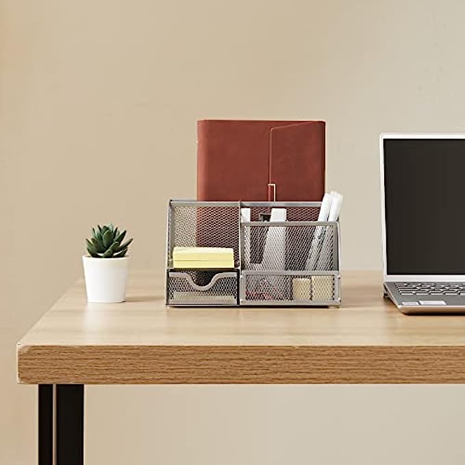 • 【SOPHISTICATED DESKTOP STORAGE】This desk organizer measures 8.7(L) x 5.5(W) x 5(H) inches and weighs 1.37 lbs. Mesh desktop organizer is perfect for dens, desks, dressers and workbenches, use it as a pencil holder, pen holder, desk organizer, makeup organizer or small tool organizer