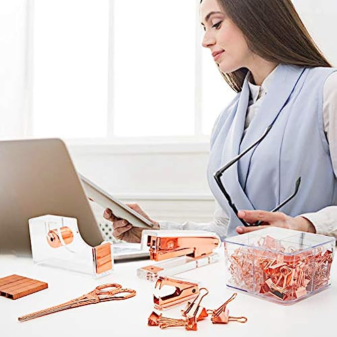Gutyble Rosegold Office Supplies Set,Package Contains Stapler,Tape Dispenser,Staple Remover,Scissors,Binder Clips,Paper Clips,Push Pins and 1000pcs Staples.Acrylic Office Desk Accessories Kits