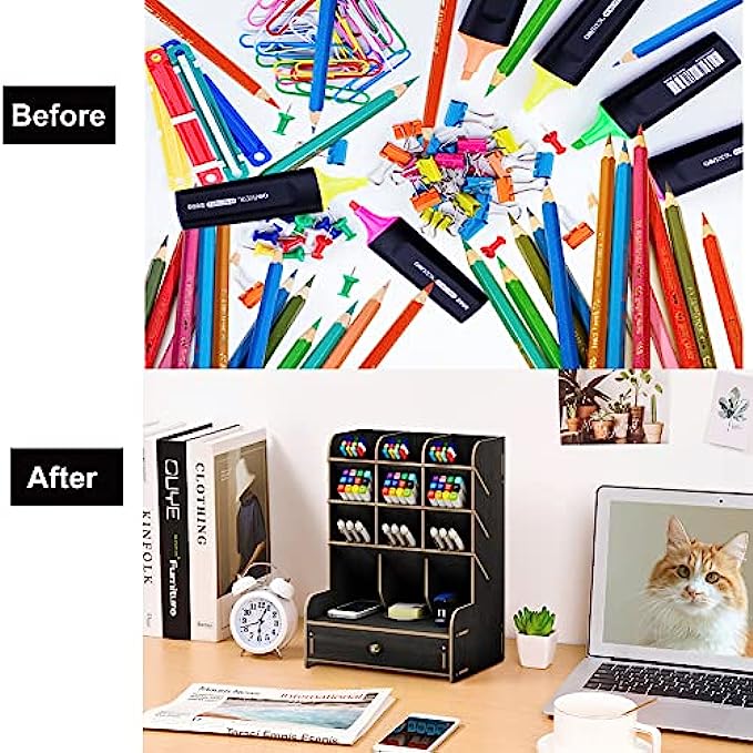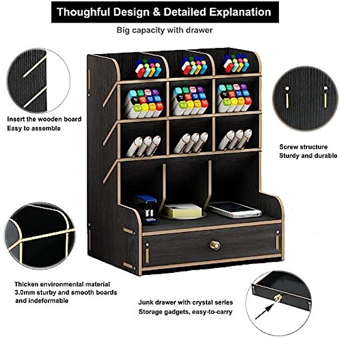 Marbrasse Wooden Pen Organizer, Multi-Functional DIY Pen Holder Box, Desktop Stationary, Easy Assembly, Home Office Art Supplies Organizer Storage with Drawer (B11-Black)