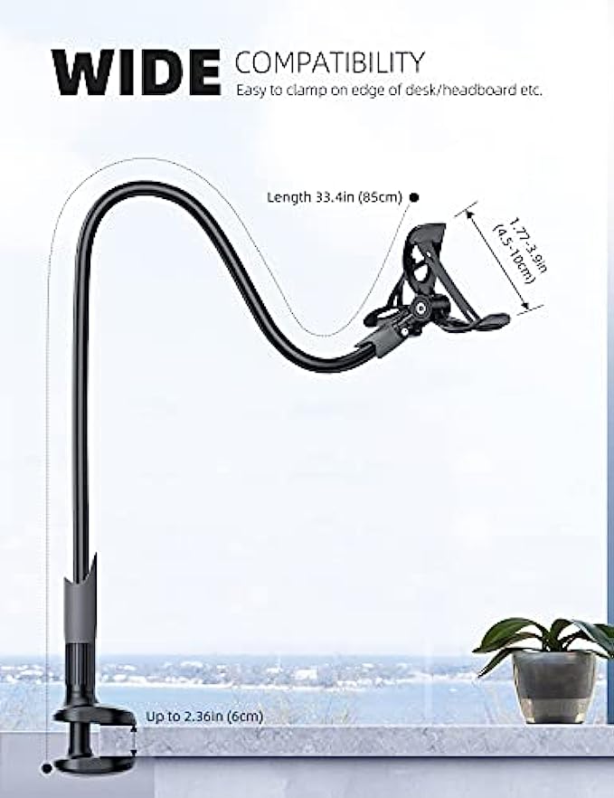 • 【Upgraded Version】Based on the pain points of similar products "Very shaky. Sag slowly after a period and can't keep a position for your phone anymore", the arm of our gooseneck phone holder for bed adopts better materials and design. It has improvements in both stability and durability. Note: the long arm is not a super flexible type, which aims to add stability.