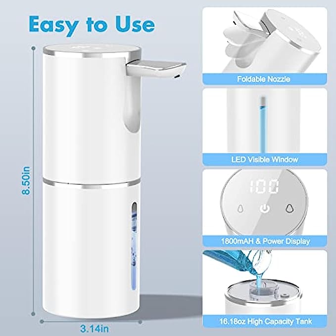 • HIGH COMPATIBILITY AND LARGE CAPACITY: The large 16.37 oz bottle is compatible with many detergents. If you use various liquids such as body wash, cleanser, facial cleanser. Bright LED lights and a visible window allow you to see how much soap is left.