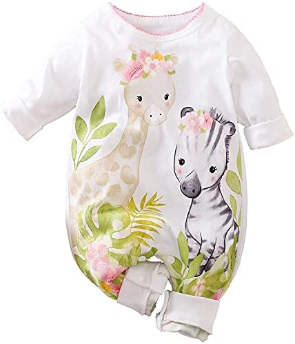 Cute Giraffe + Zebra With Floral Print Long Sleeve Baby Girl Clothes White Jumpsuit For Baby One-Piece Romper
