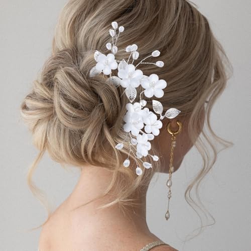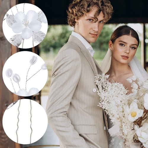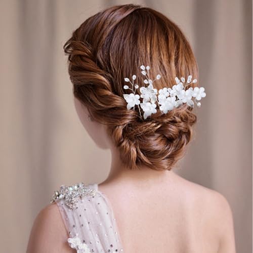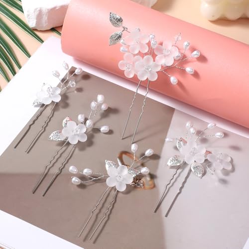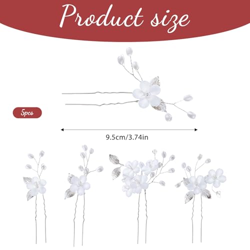 Sparkly Bridal White Flower Hair Pins Artificial Pearl Rhinestone Flower Hair Barrette Handmade 5 Pcs Crystal Pearl Clips White Flowers Zircon Clips for Brides Bridesmaids Women Girls (Silver)