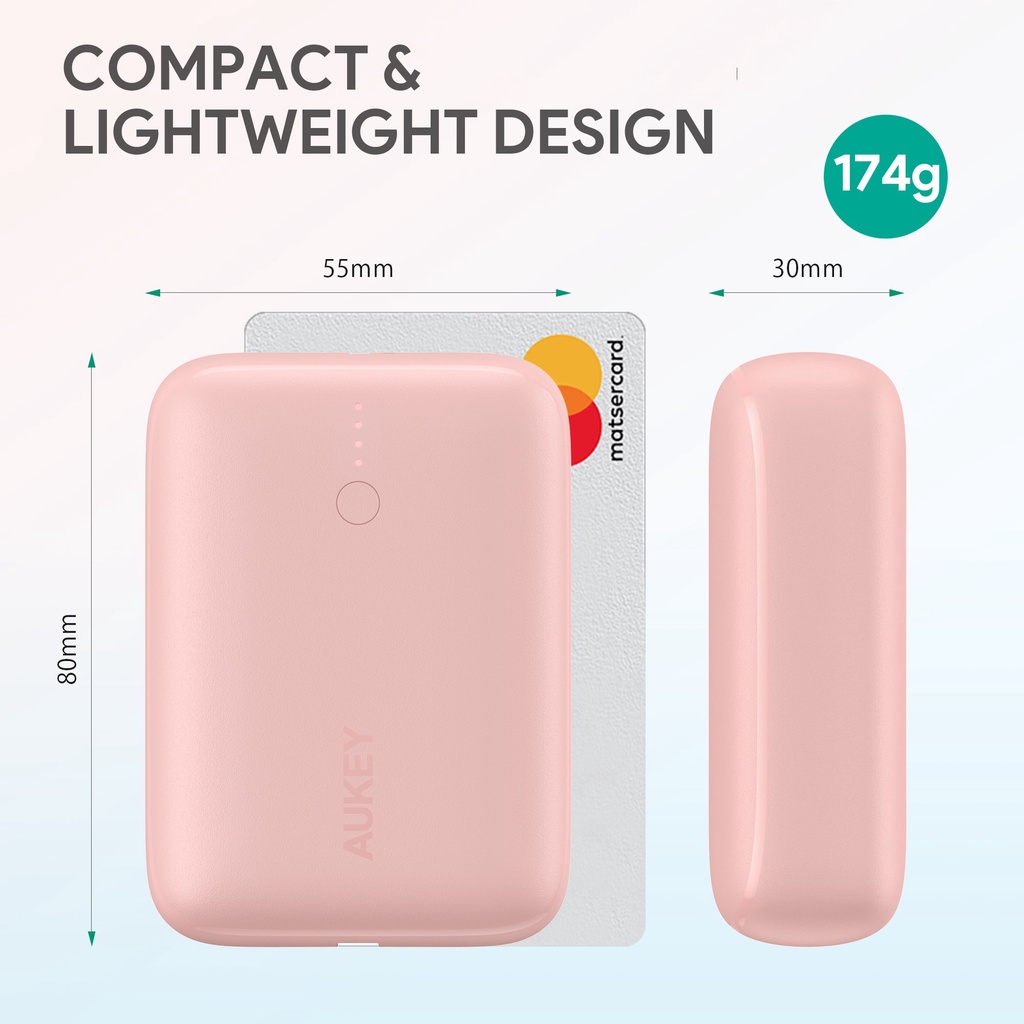 Best Feature(s):Pretty pink and compact ? Value For Money:Yes if you got the $$$ Product Quality:Solid build Fast delivery! Came fully charged but still able to charge. Have yet to use em. Like that it’s compact and it’s in pretty pink haha perhaps good for 1 full charge of iPhone 13 pro. Not as heavy as I expected it would. Been contemplating on this as Aukey isn’t a cheap brand. Hope it will last!