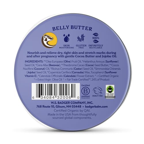 Badger Belly Butter, Organic Stretch Mark Cream for Pregnant Belly, Rich Hypoallergenic Moisturizing Organic Cocoa Butter & Coconut Body Butter for Women, 2 oz Tin