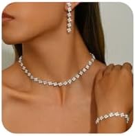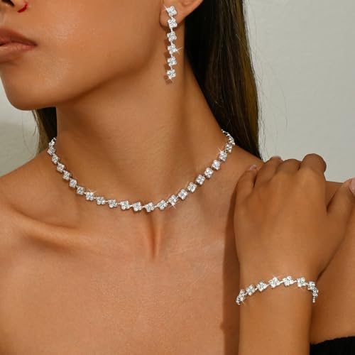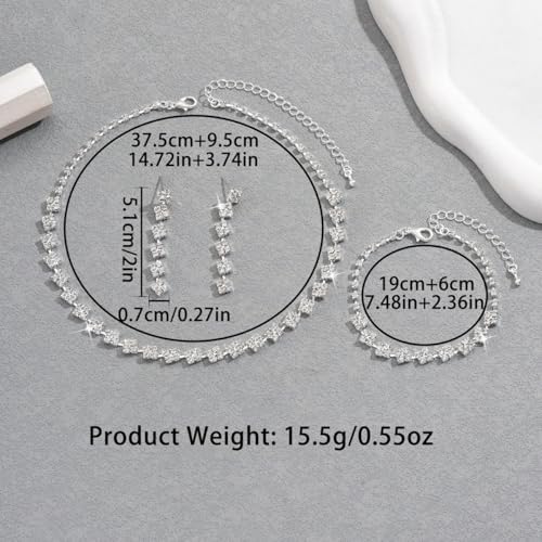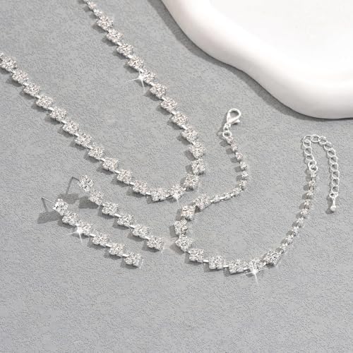 Silver Wedding Jewelry Set for Women Brides Rhinestone Necklace Bracelet Dangle Earrings Sets for Bride Bridesmaid Crystal Prom Costume Jewelry Accessories