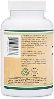 Colostrum Supplement 120 Capsules, 1,000mg per Serving (Bovine Colostrum Powder from First Milking Only, Std. to Contain 15% IgG Immunoglobulins) No Fillers, Third Party Tested by Double Wood