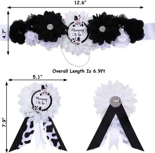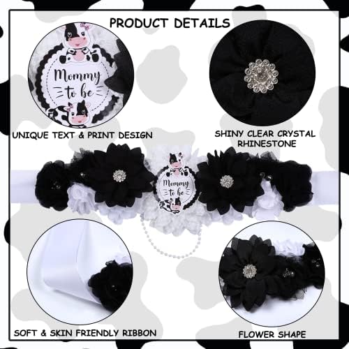 JOYMEMO Cow Baby Shower Sash - Maternity Sash Kit with Mom to Be Dad to Be Corsage Pins, Cow Gender Reveal Pregnancy Flower Belly Belt Photo Props New Parents Keepsake, Farm Cow Print Party Decor