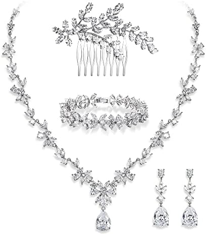 Sponsored Ad - Crysdue Wedding Jewelry Set for Women, Floral Leaf Vine Teardrop Necklace Dangle Earrings Bracelet and Hair Comb, Cubic Zirconia Elegant Party Prom Jewellery for Bridal Bridesmaid