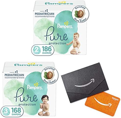 Diapers Size 2, 186 Count - Pampers Pure Protection Disposable Baby Diapers, Hypoallergenic and Unscented Protection with Diapers Size 3, 168 Count and Amazon.com Gift Card in a Mini Envelope