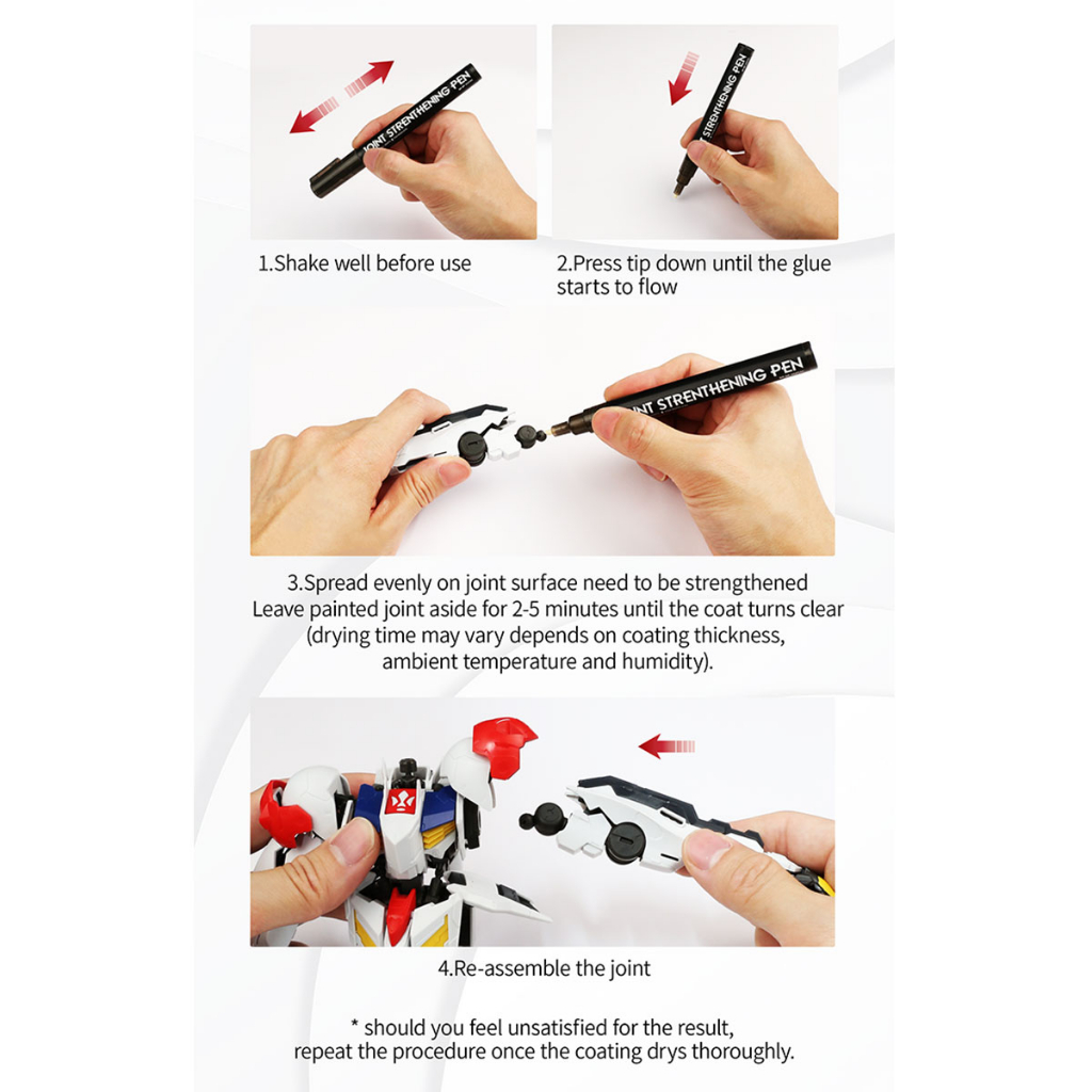 Appearance:instructions are on the pen itself Quality:very good quality First time using and is very effective and easy to use. I think its important to use this on all builds even of the joint isn’t lose as it does a lot for poses.