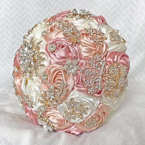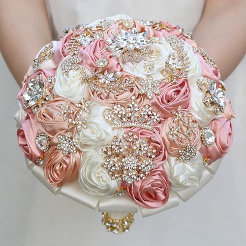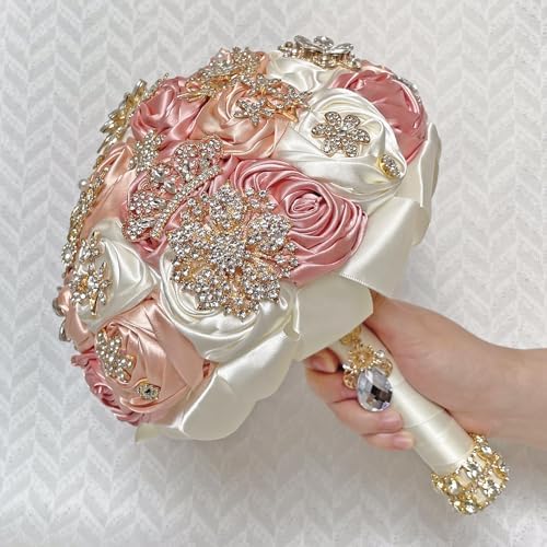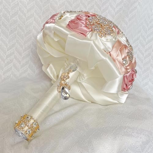 Sponsored Ad - Handmade Satin Rose Floral Bling Pearl Decor Bridal Wedding Bouquet Rhinestone Pendant Artificial Brooch Flowers for Bride Bridesmaid Quinceanera