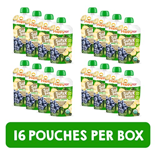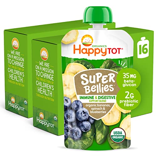 Happy Tot Organics Stage 4 Baby Food Pouches, Gluten Free, Vegan Snack, Super Bellies, Fruit & Veggie Puree, Banana, Spinach & Blueberries 4 Ounce (Pack of 16)