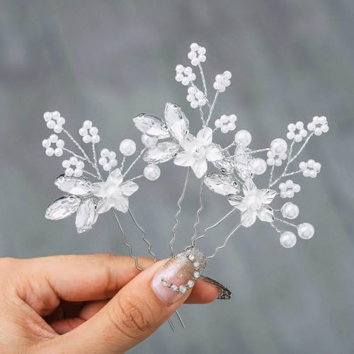 Heread Crystal Bride Wedding Hair Pins Silver Flower Bridal Head Piece Pearl Hair Accessories for Women and Girls (Pack of 3) (A Silver)