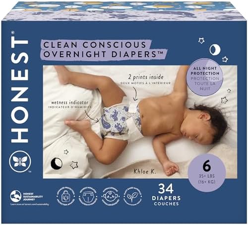 Clean Conscious Overnight Diapers for Sensitive Skin, Hypoallergenic Fragrance-Free Baby Diapers, Cozy Cloud and Star Signs Design, Club Box, Size 6 (35+ lbs), 34 Count
