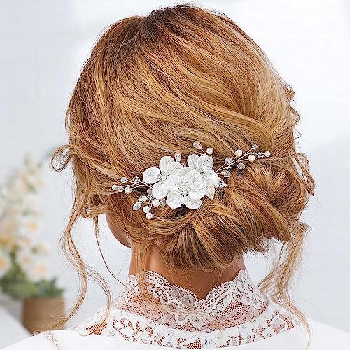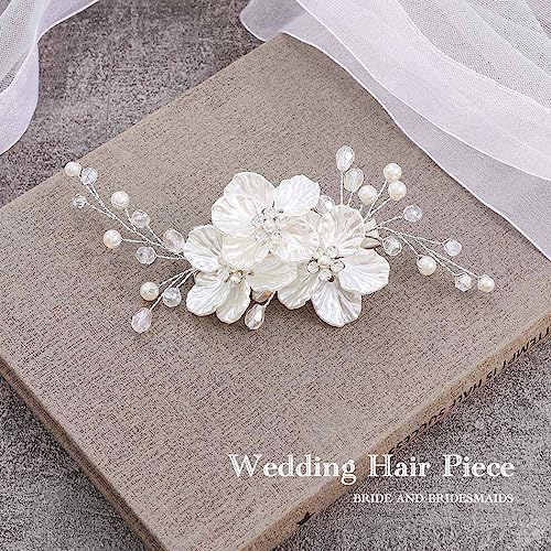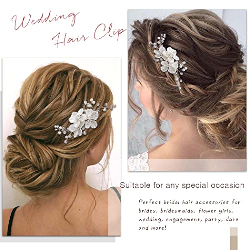 Jakawin Bride Flower Wedding Hair Piece Silver Pearl Hair Clip Rhinestone Crystal Headpiece Leaf Bridal Hair Accessories for Women FJ01 (1 Silver)