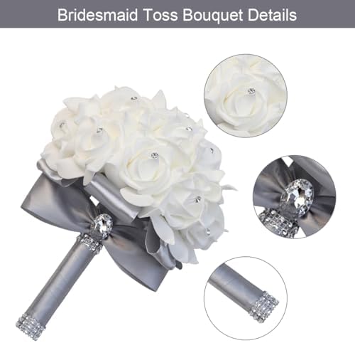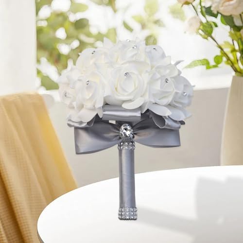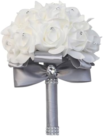 Sponsored Ad - Wedding Bouquets for Bride,9 x 7 in Bridal Bridesmaid Holding Flowers with Crystal Diamond and Soft Ribbons,White Rose Bridal Flowers,Bridesmaid Hand Flowers,Artificial Bouquet (Gray)