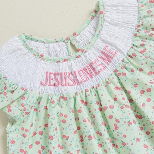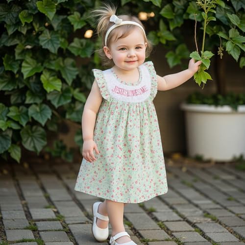 KMBANGI Toddler Baby Girl Christian Outfit Jesus Loves Me Dress Ruffle Sleeveless Smocked Dresses Baptism Outfit Princess
