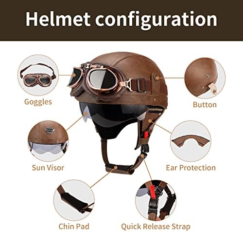 German Style Leather Motorcycle Half Helmet for Adults Men Women, DOT Approved Vintage Cap Half Face Shell Motorcycle Helmets for Cruiser Chopper+Goggles