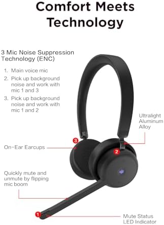 Wireless VoIP Headset Teams Certified, Noise-Canceling Mic, Bluetooth 5.3 Multipoint, USB-A Receiver, 31-Hour Talk & 60-Hour Playback, Lightweight Over-Ear Design, Replaceable Earcups