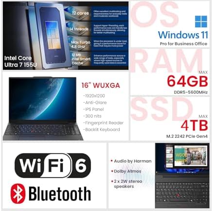 ThinkPad E16 Gen 2 16" Business Laptop, High-Performance Intel Core Ultra 7 155U (>i7-13700H), 64GB DDR5, 4TB SSD, WUXGA Display, Fingerprint, Backlit Keyboard, Wi-Fi 6E, Win 11 Pro