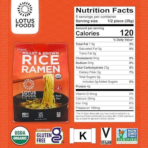 Lotus Foods Organic Millet and Brown Rice Ramen Noodles - Gluten Free Instant Ramen Noodles, Vegan, Low Sodium, Made with Brown Rice Flour and Millet Flour, Ready in 4 Minutes - 10 Oz Bag (Pack of 1)