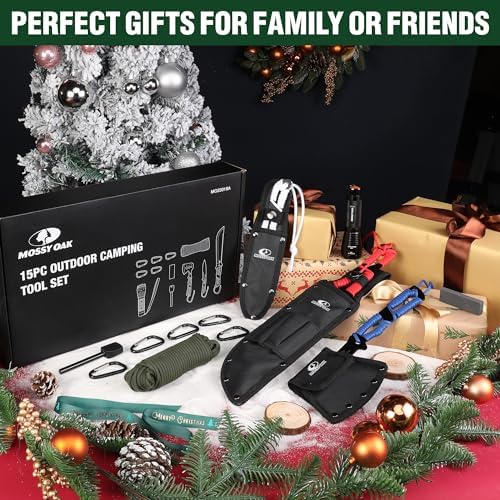 Mossy Oak Hatchet and Machete Knife Set with Sheath, One-Piece Axe & Hunting Knives with Paracord Handle, Zoomable Flashlight, Many Other Tools, Ideal Gift for Men Who Likes Hunting Outdoor Adventure