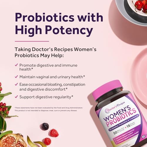 Doctor's Recipes Women’s Probiotic, 60 Caps 50 Billion CFU 16 Strains, with Organic Cranberry, Digestive Immune Vaginal & Urinary Health, Shelf Stable, Delayed Release, No Soy Gluten Dairy