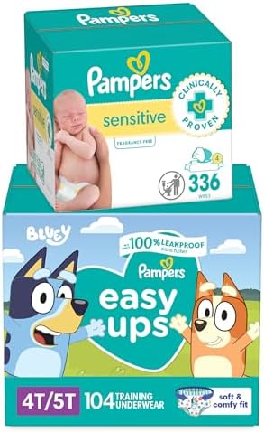 Easy Ups Bluey Pull On Training Pants Boys and Girls, 4T-5T, 104 Count with Sensitive Water Based Baby Wipes 4X Pop-Top Packs (336 Count)