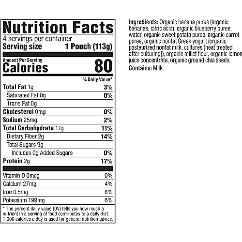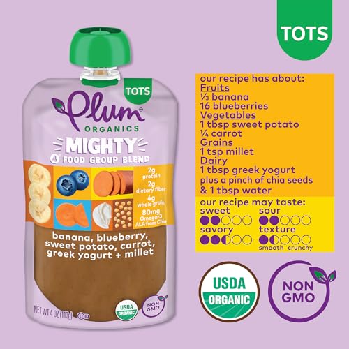 Plum Organics Mighty 4 Organic Toddler Food - Banana, Blueberry, Sweet Potato, Carrot, Greek Yogurt, and Millet - 4 oz Pouch (Pack of 12) - Organic Fruit and Vegetable Toddler Food Pouch