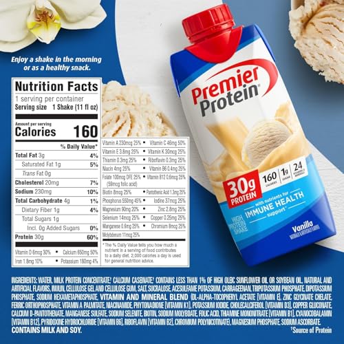 Premier Protein Protein Shake, Vanilla, 30g Protein, No Added Sugar, 11 fl oz Pack of 12 (Packaging May Vary)