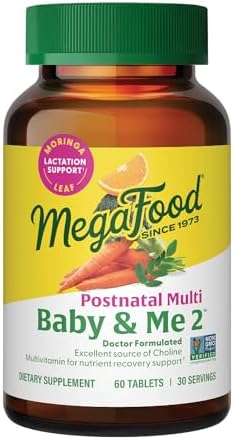 MegaFood Baby & Me 2 Postnatal Vitamins for Women Breastfeeding with Folate (Folic Acid Natural Form), Choline, Iodine, Vitamin D, Moringa Leaf and More - 60 Tabs (30 Servings)