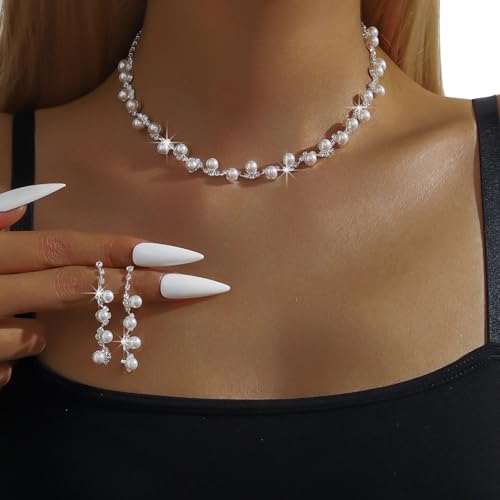 Silver Rhinestone Pearl Necklace Sets for Wedding Brides Bridesmaid Crystal Necklace Earrings Bracelet Set Sexy Pearl Collar Necklace Elegant Pearl Earrings Bracelet Sets for Women Costume Accessories