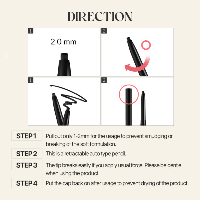 Suitability:10/10 Performance:10/10 Formulation:10/10 Made in Korea. A Korean brand eyeliner. Don't need to use a sharpener. Just roll up and down to use and keep. Very convenient.