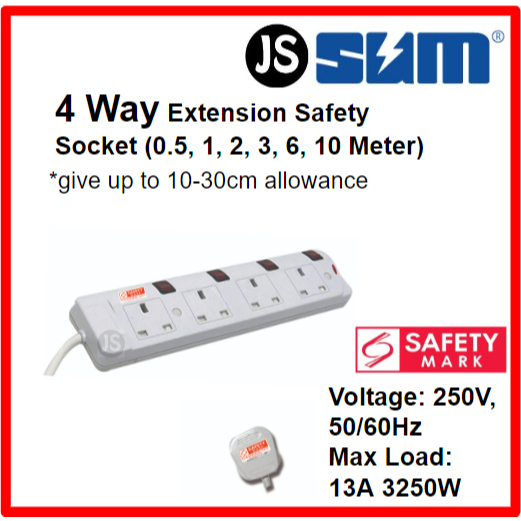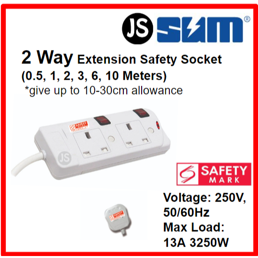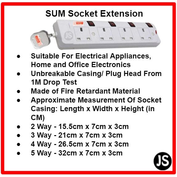 SUM 2/3/4/5 WAY Extension Socket (0.5, 1, 2, 3, 6, 10 Meters) With Singapore Safety Mark