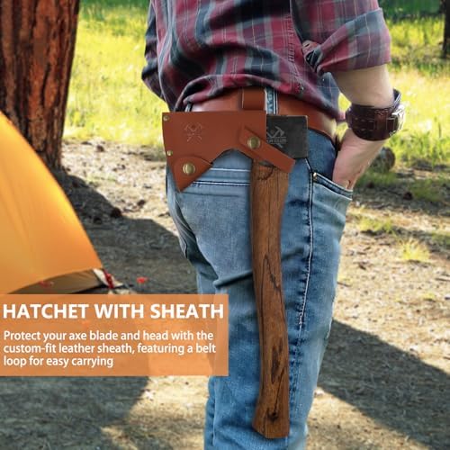 15.7" Hand Forged Hatchet Axe, Camping Hatchet with 1065 Carbon Steel & Wooden Handle, Bushcraft Axe with Leather Sheath and Axe Sharpener, Survival Axe for Outdoor Adventures and Gardening