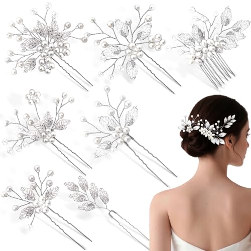 7 Pcs Silver Bridal Wedding Hair Accessories, YINGFENG Hair Pins for Women and Crystal Pearl Hair Clips,Flower Girl Hair Accessory, Hair Pins for Bride, Bridesmaids and Girls