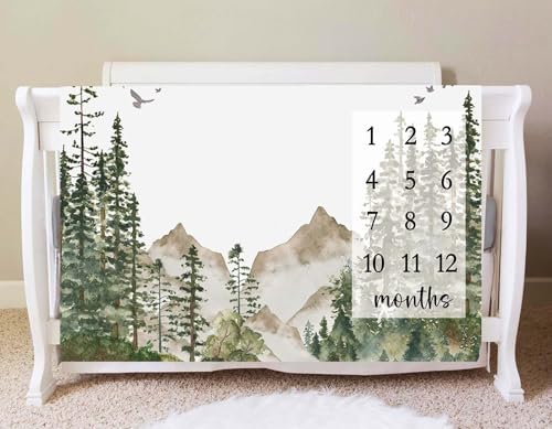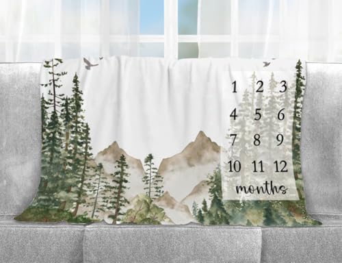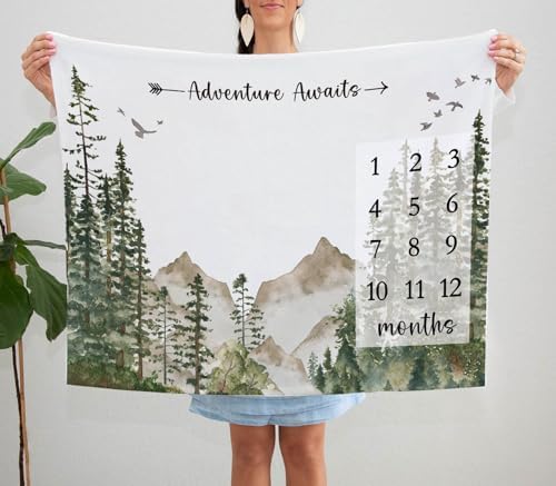 Yuzioey Adventure Awaits Milestone Blanket, Forest Mountain Baby Growth Chart Monthly Blanket, Watch Me Grow Woodland Mountain Tree Baby Nursery Shower(50"x40")